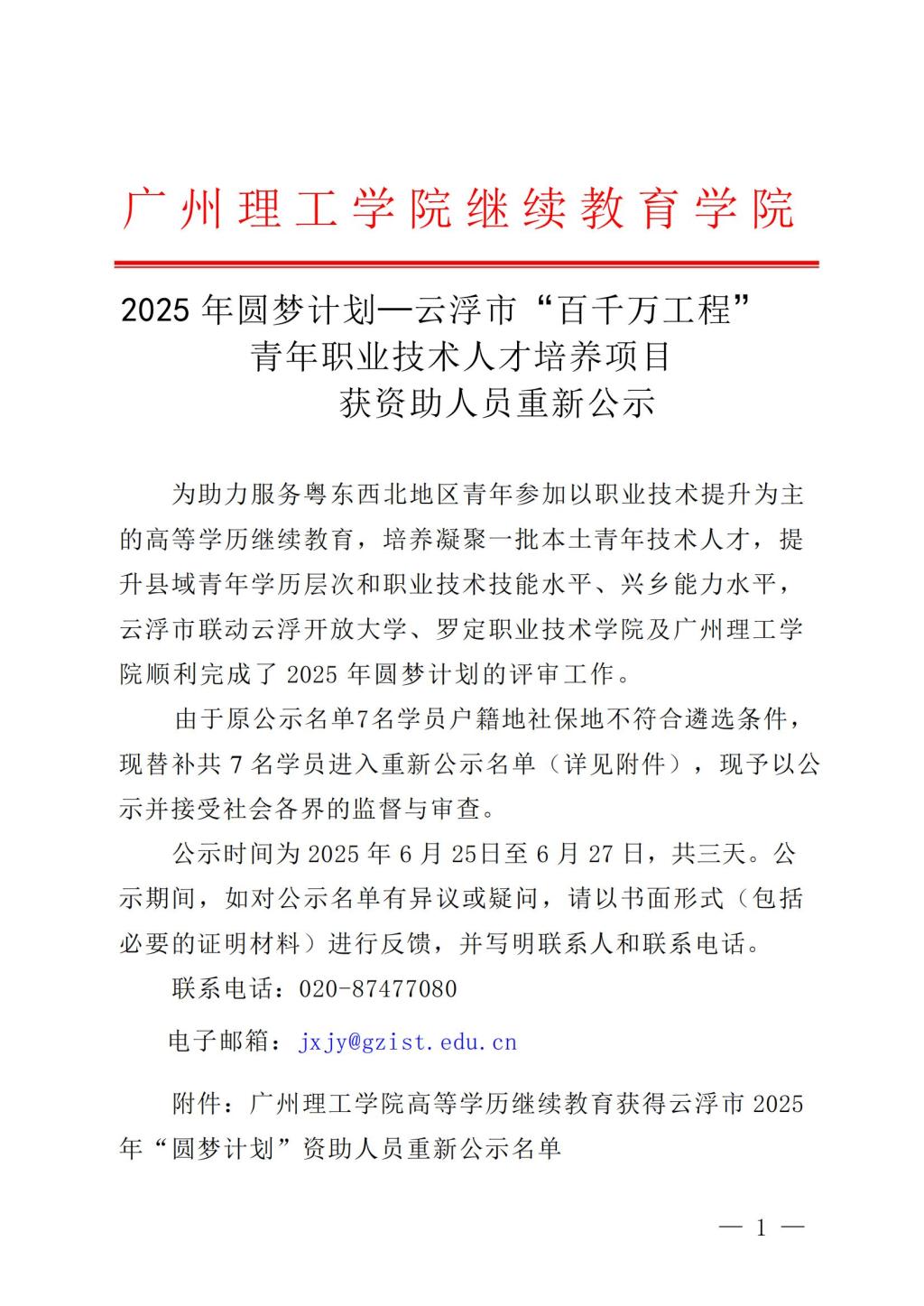2025年圆梦计划—云浮市“百千万工程”青年职业技术人才培养项目获资助人员重新公示