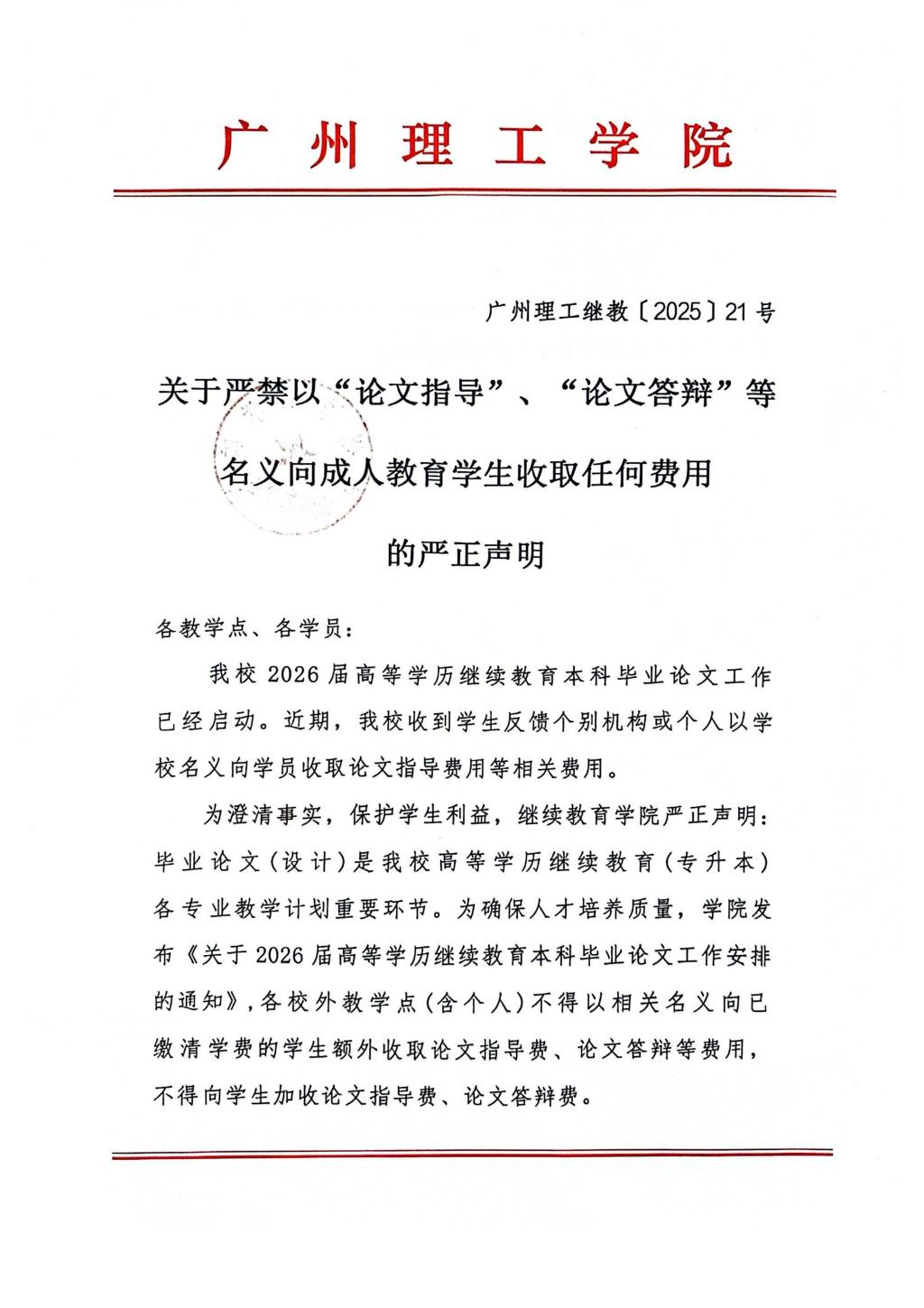 关于严禁以“论文指导”、“论文答辩”等名义向成人教育学生收取任何费用的严正声明