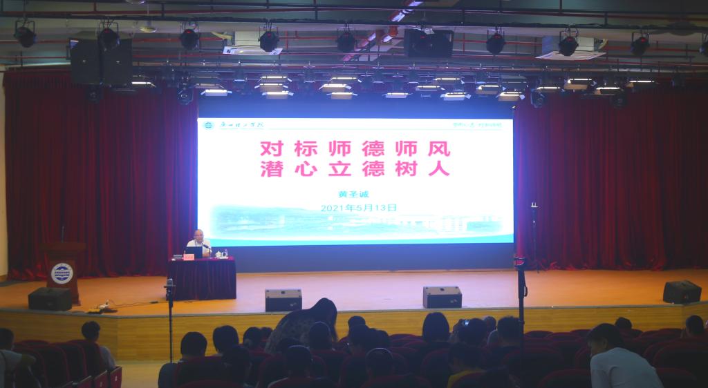 黄圣诚书记用图文并茂的方式,再一次领学习近平总书记重要讲话精神。他回顾了党的十八大以来习近平总书记到高校实地考察的重要讲话,阐述了思想政治理论课在高校教育的重要性,强调了为什么要着力培养担当民族复兴大任的时代新人。黄书记强调了习近平总书记对师风师德建设的要求,即做好“三个牢固树立”“四有好老师”“四个相统一”“三个传播”“三个塑造”“六要标准”,深入学习了师德师风相关制度文件规定,希望广大教职工作好坚持教书育人、言传身教、学术规范和经世致用。