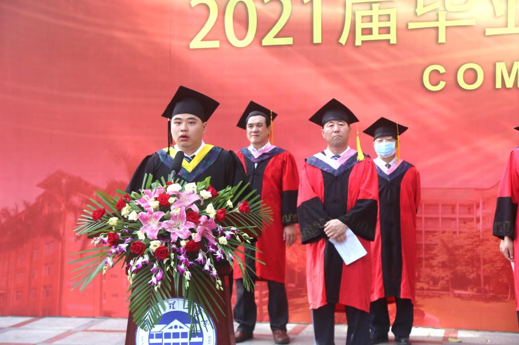 毕业生代表、团省委优秀共青团员、17级土木工程1班刘瑜海发言,代表本届毕业生,向陪伴成长、培养成才的领导、老师、亲友,致以衷心的感谢和崇高的敬意!向同窗好友表示热烈的祝贺和诚挚的祝福!