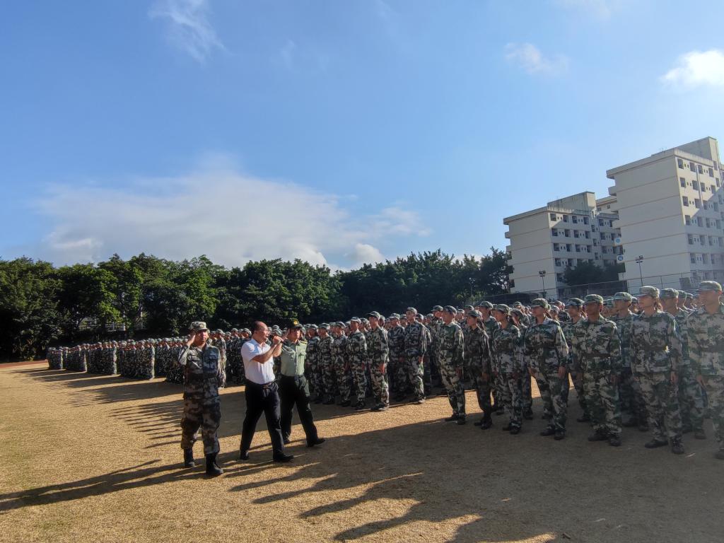 党委书记黄圣诚检阅受训队伍。各方阵齐装列阵、昂首挺胸,接受检阅。黄圣诚书记向全体学生致以亲切的问候:“同学们好!”“同学们辛苦了!”同学们报以“报效祖国”“强国有我”铿锵的青春誓言。