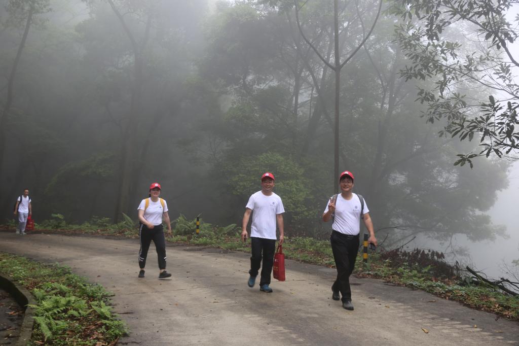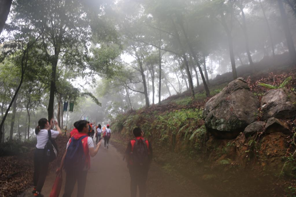 8:30分,随着一声出发号令,胡社军校长、黄圣诚书记等党政领导带领第一梯队率先出发,其他5个梯队的教职工紧跟其后。大家穿过穗丰村,从小石船景区直入山道,一路领略帽峰山森林公园的云山、迷雾、密林、繁花,听山涧林泉潺潺,看飞鸟穿过云林,在轻雾中向海拔534.9米主峰进发。