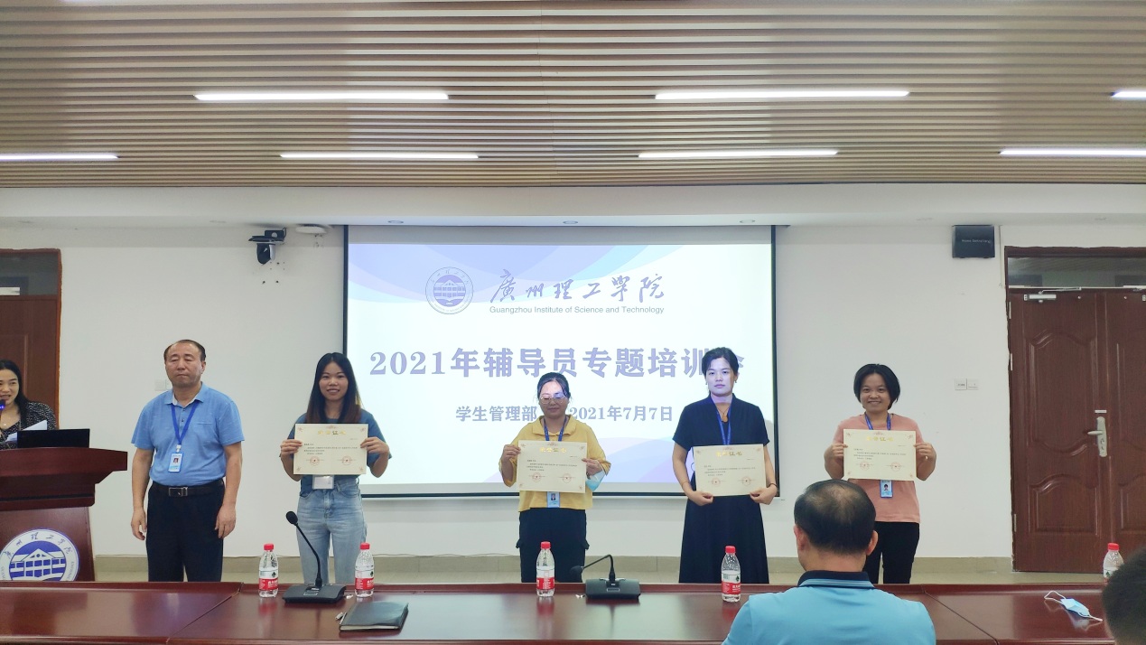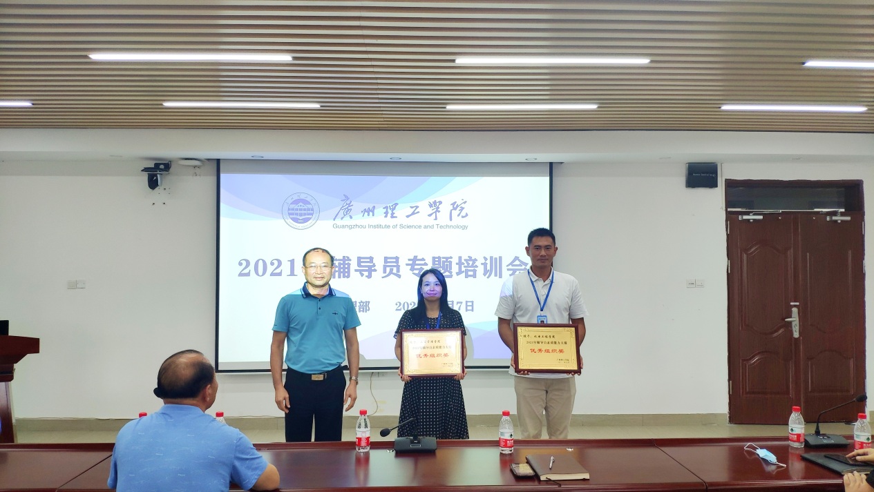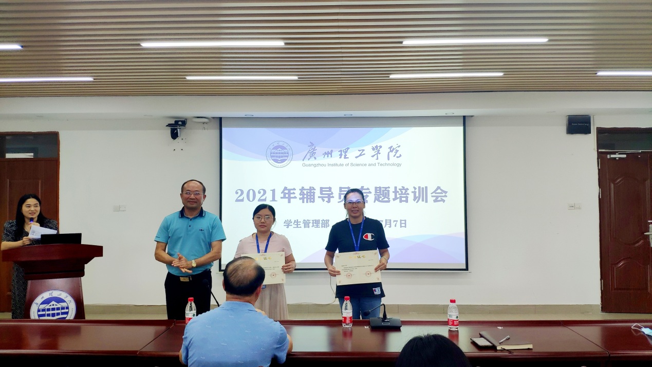 会上对我校在广东高校学生工作优秀案例征集活动中取得优秀成绩的辅导员和优秀学院进行了颁奖仪式,鼓励全体辅导员向他们学习,积极参加比赛,提升职业素养。