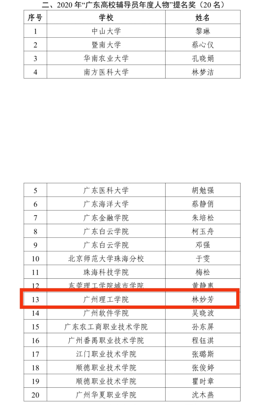 近日,广东省教育厅公布了 “2020年广东高校辅导员年度人物”,“2020年广东大学生年度人物”评选结果,我校辅导员林妙芳老师荣获“2020年广东高校辅导员年度人物”提名奖,建筑工程学院学生梁宇铭荣获“2020年广东大学生年度人物”提名奖。